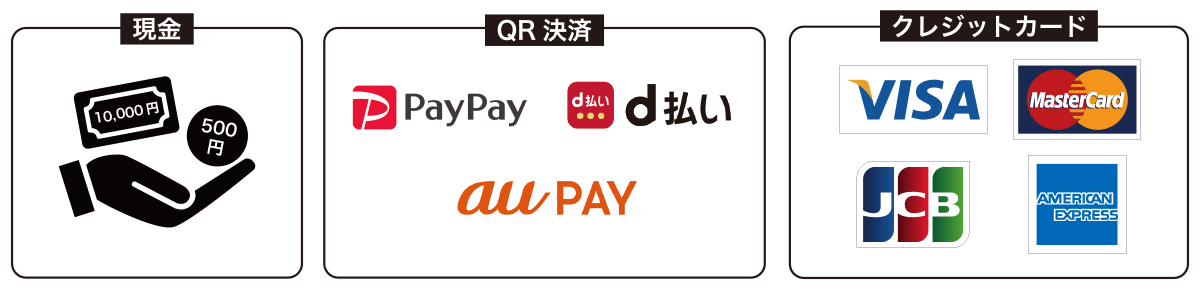 - クレジット決済・QR決済・現金払いのそれぞれ併用はお断りさせていただく場合がございます。