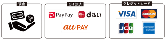 お支払いは、現金払いの他に、下記のクレジットカード・QR決済などのキャッシュレス支払いがご利用いただける予定です。