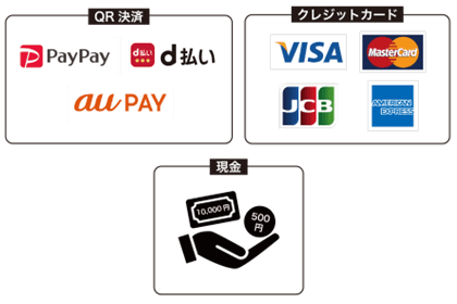 - キャッシュレス決済は、端末の通信状況によりご利用いただけない場合もございます。その際は、現金にてお支払いくださいますようお願いいたします。