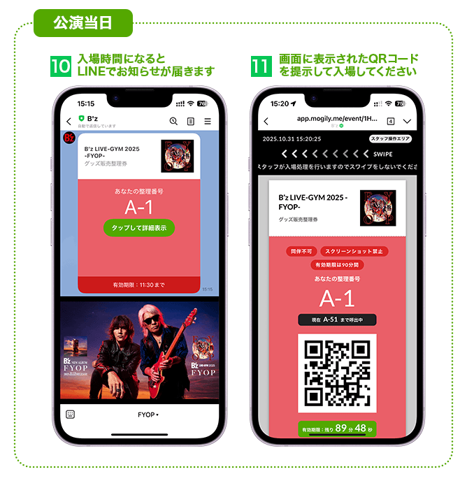 開始時間は当日会場にて、または「B’z公式」LINEアカウント等にて発信予定です。整理券をお持ちでない方は、当日のフリー販売をご利用ください。