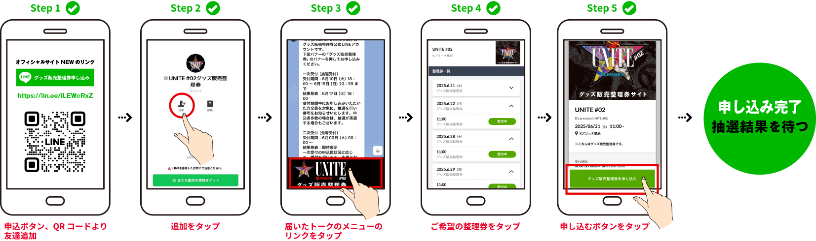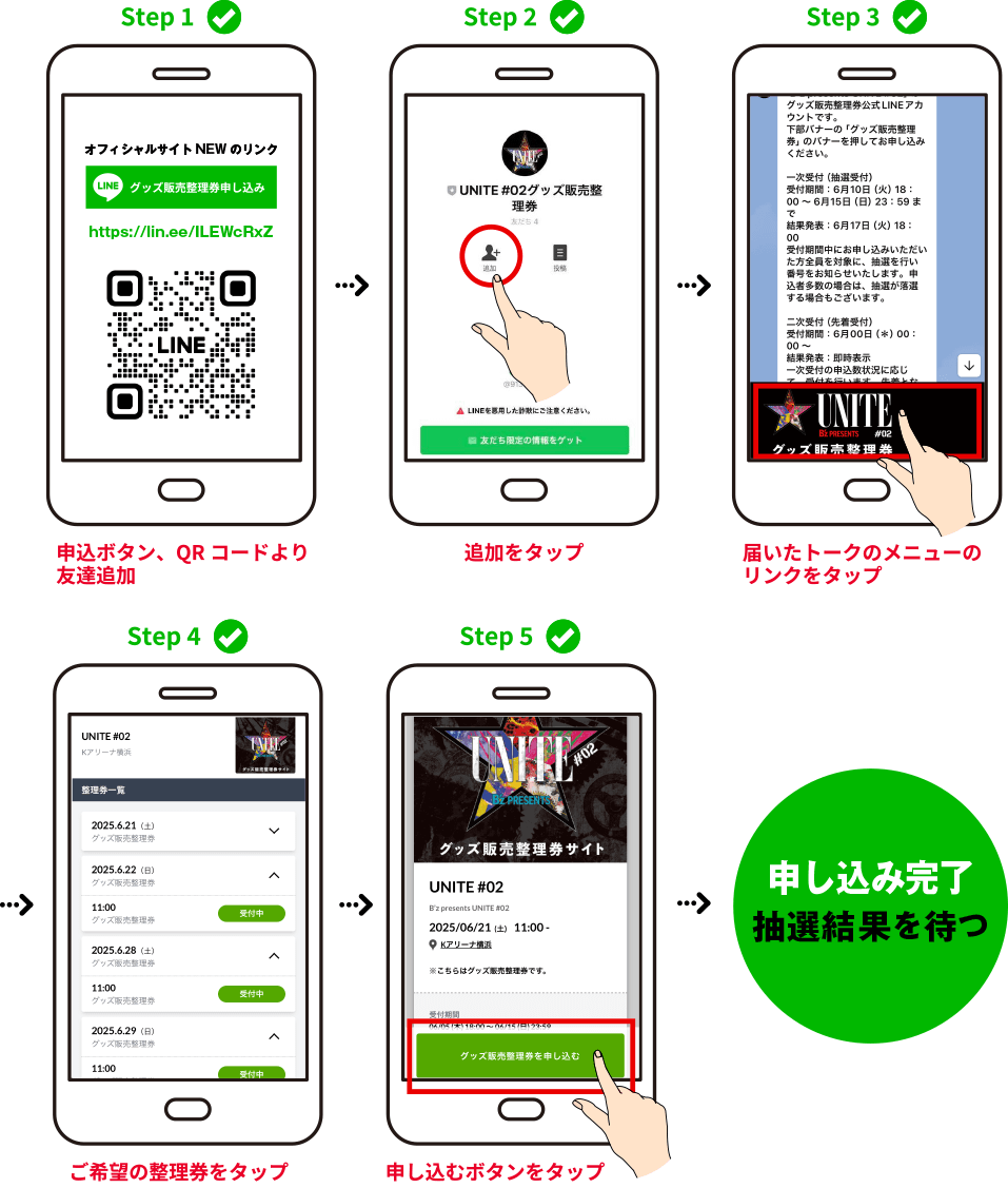 ● グッズ販売整理券は、6⽉10⽇(⽕)18:00 〜 6⽉15⽇(⽇)23:59まで一次抽選受付を行い、6月16日(月)以降に、抽選結果を発表いたします。抽選受付期間中に「UNITE #02グッズ販売整理券」LINEアカウントを友達追加していただき、申し込みページからご希望の日程の整理券をお申し込みください。友達追加だけでは、お申し込みは完了となりませんので、必ずご希望日の整理券を選び「申し込み」を完了させてください。