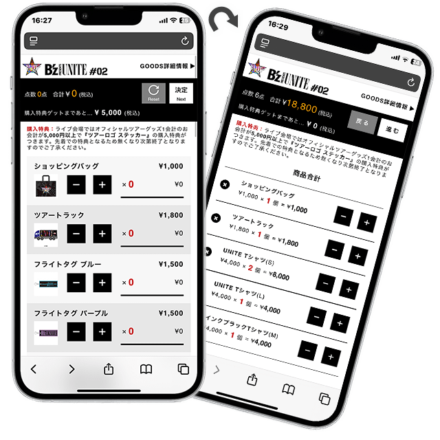 ● グッズ販売整理券をお持ちのお客様をすべてご案内後、整理券なしでのフリー販売(通常販売)を予定しておりますが、開始時間は当日X(旧Twitter/@Bz_Solo_Info)、LINE(UNITE #02グッズ販売整理券アカウント)等にてご案内いたします。終演後販売は、フリー販売の予定となります。